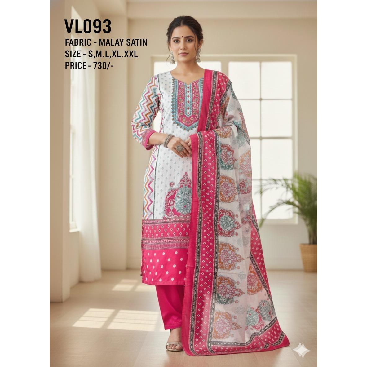 Grace meets comfort in the VL093 suit set, crafted from smooth and lustrous Malay satin fabric. Featuring a beautiful mix of intricate prints and vibrant pink accents, the kurta showcases detailed patterns on the neckline and sleeves for a refined ethnic look. Paired with a matching bottom and a lightweight printed dupatta, this ensemble is perfect for festive occasions, family gatherings, or casual celebrations. Available in sizes S to XXL, it offers a flattering fit with a touch of modern elegance—all at an attractive price of 730/-.